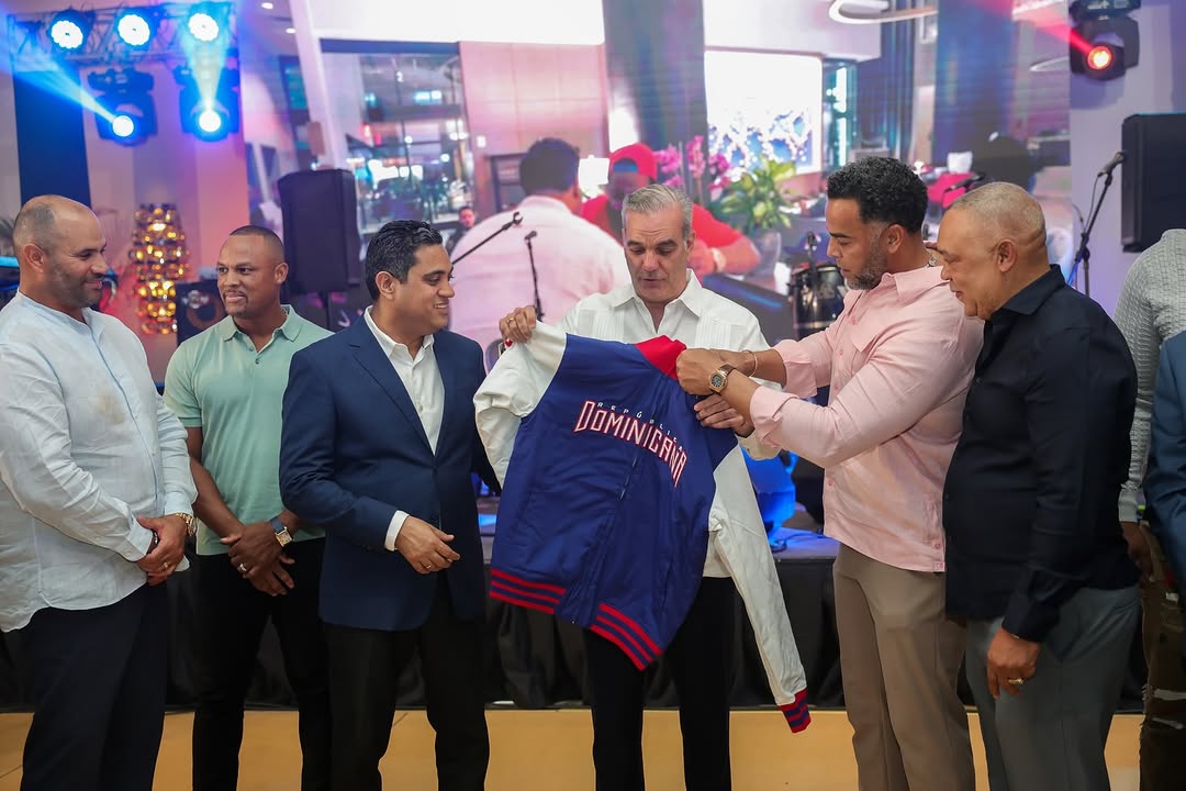 El presidente dominicano Luis Abinader recibe de las manos de Nelson Cruz gerente general de la selección dominicana para el Clásico Mundial de Beisbol 2026, una chaqueta y gorra del equipo que nos representara, acompaña el Ministro de Deportes Kelvin Cruz.